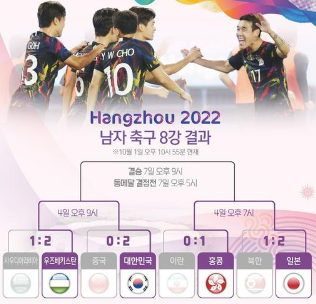 아시안게임 남자축구 3연패를 노리는 황산홍(Huang Shanhong)이 중국팀을 꺾고 2022 항저우 아시안게임 준결승에 진출했다. 중국 항저우 아시안게임 한국팀과 중국팀의 8강전에서 응원 페이지에 중국인 응원음이 늘어난다는 논란이 일면서 관련 서비스가 중단됐다. 2022 항저우아시안게임 축구 결과 스포츠는 2일 "최근 '클릭응원'의 목적을 악용한 사례가 있어 불필요한 오해를 불러일으켜 서비스를 잠정 중단했다"고 밝혔다.